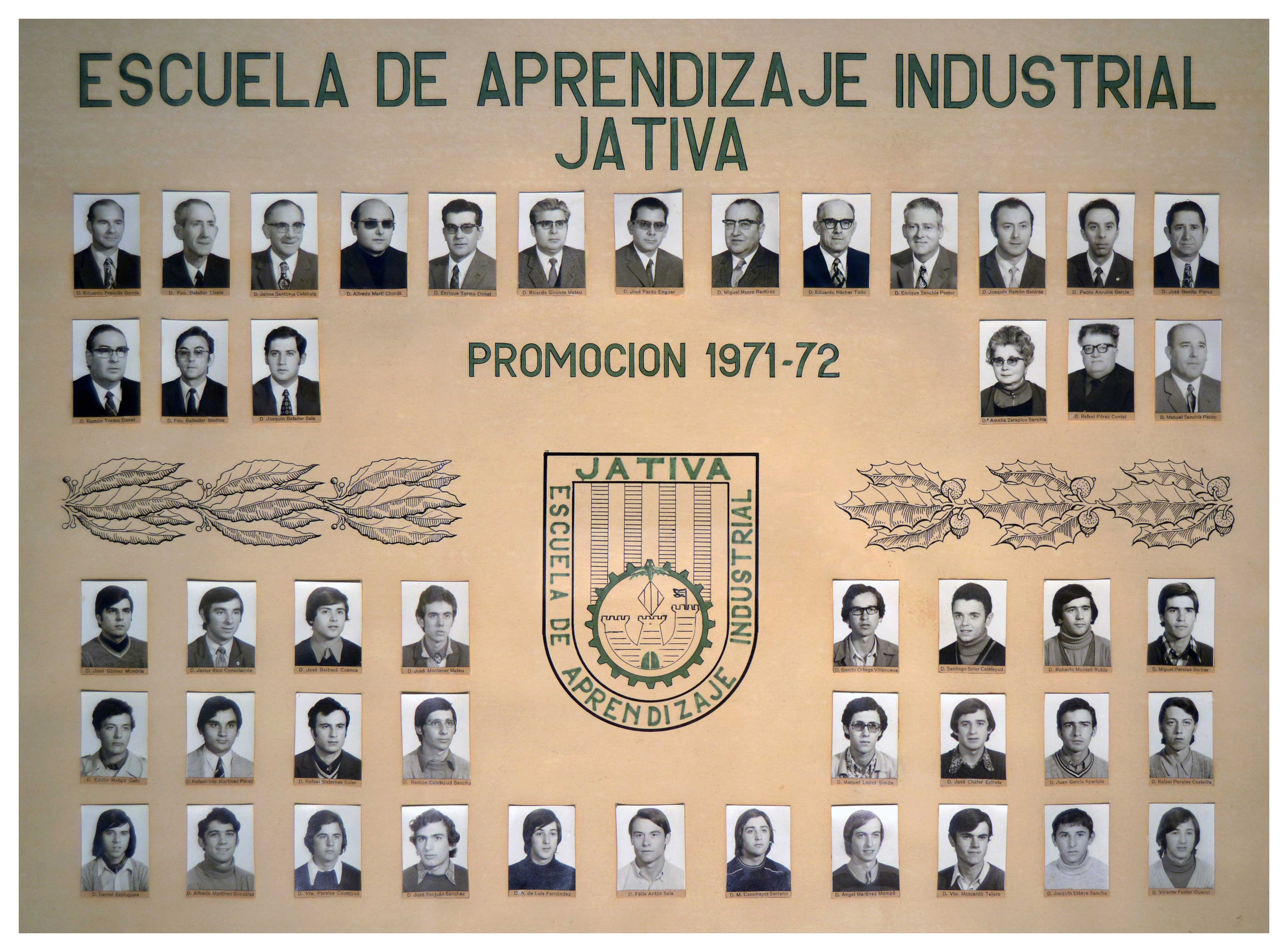 Sobre la futura denominación de esta Escuela se proponían varios nombres como era: «Honorato Juan», «Cerdán de Tallada», «José García Buades», «Vicente Aleixandre», «José A. Maravall» al final se acordó la propuesta de «Honorato Juan» pero no se llevó a cabo. Promoción 1971 1972 José Gómez Mondriá Javier Rico Consolación José Barberá Cuenca José Montaner Mateu Benito Ortega Villanueva Santiago Soler Calatayud Roberto Montell Rubio Miguel Perales Barber Emilio Mataix Gato Rafael Vicente Martínez Pérez Rafael Sisternes Soler Ramón Calatayud Sancho Manuel López Simón José Cháfer Estrela Juan García Aparicio Rafael Perales Castella Daniel Esplugues Alfredo Martínez González Vicente Perales Calatayud José Sanjuán Sánchez A. de Luis Fernández Félix Antón Sala M. Casamayor Serrano Ángel Martínez Mompó Vicente Moscardó Tejero Joaquín Esteve Sancho Vicente Fuster Querol Se acordó solicitar nuevas especialidades para el curso 72-73. La Rama Administrativa y Comercial en la especialidad Administrativa y la Rama de Automoción en la especialidad Mecánica y Electricidad del Automóvil. |